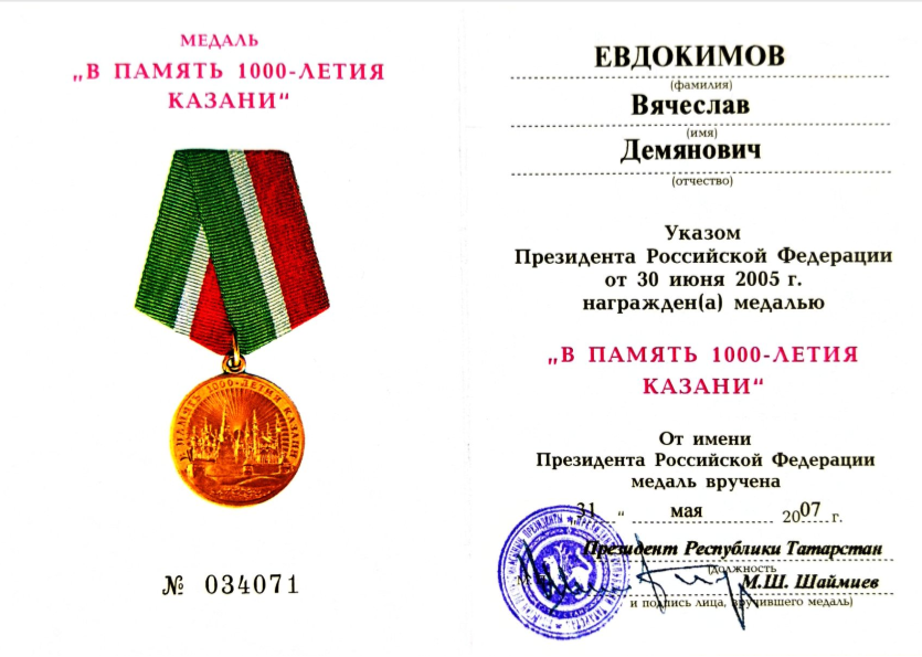 In 2005, Vyacheslav Demyanovich Evdokimov was awarded the medal "In Memory of the 1000th anniversary of KAZAN" by Decree of the President of the Russian Federation dated June 30, 2005 for charity and contribution to the development of modern musical culture.